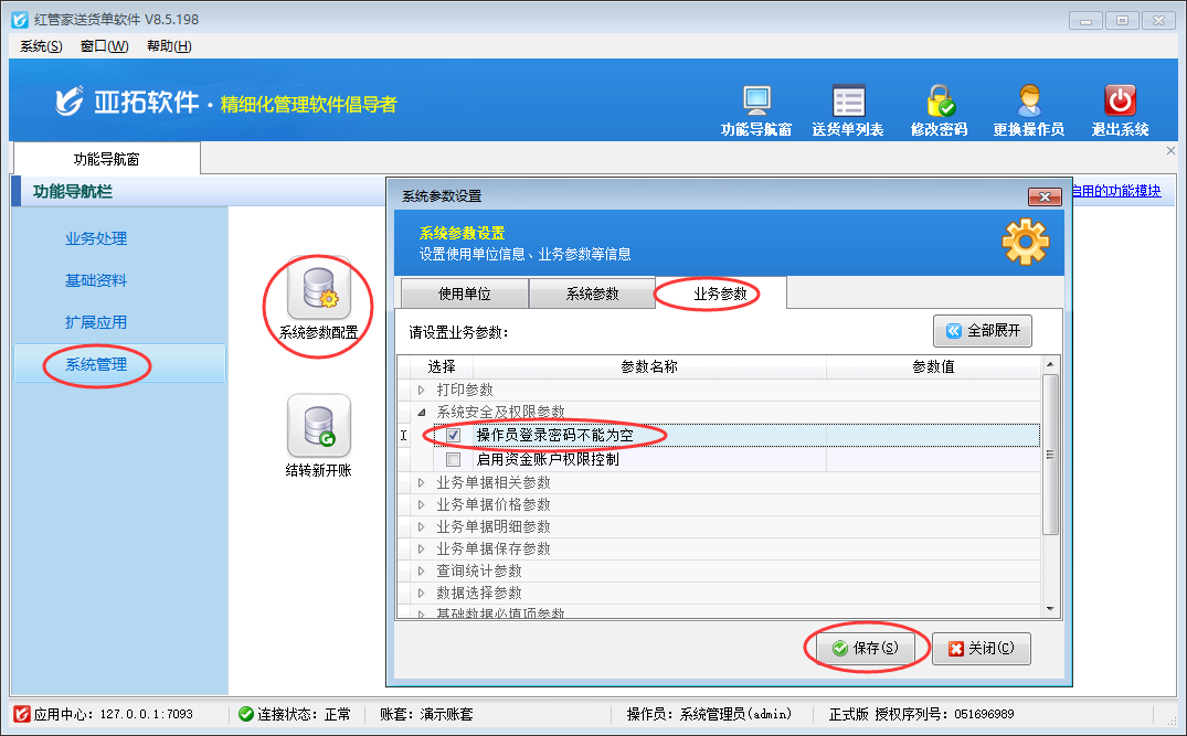 亞拓管理軟件、紅管家送貨單軟件、紅管家倉庫管理軟件、紅管家出納記賬軟件等軟件內(nèi)都可以設(shè)置多個操作員,并可以設(shè)置操作員登陸密碼不能為空,本篇文章我們以紅管家送貨單軟件為例詳細(xì)介紹一下如何設(shè)置操作員登陸密碼不能為空? 在功能導(dǎo)航窗點擊“系統(tǒng)管理”→“系統(tǒng)參數(shù)設(shè)置”→“業(yè)務(wù)參數(shù)”可以打開“業(yè)務(wù)參數(shù)”配置界面,在系統(tǒng)安全及權(quán)限參數(shù)內(nèi)