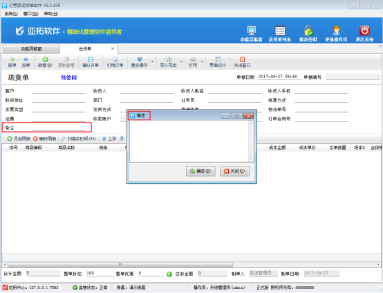 紅管家送貨單軟件、紅管家倉庫管理軟件和亞拓管理軟件單據(jù)中的擴展信息及備注等都可設(shè)置取值方式,都可以通過彈出窗口輸入的方式進(jìn)行錄入信息。當(dāng)錄入的備注或者擴展信息文本內(nèi)容比較多時,由于界面有限,直接錄入窗口無法顯示全部的錄入信息,我們可以設(shè)置該數(shù)據(jù)項的取值方式為“彈出窗口輸入”,方便錄入更多的數(shù)據(jù)內(nèi)容。 我們以送貨單軟件為例,示