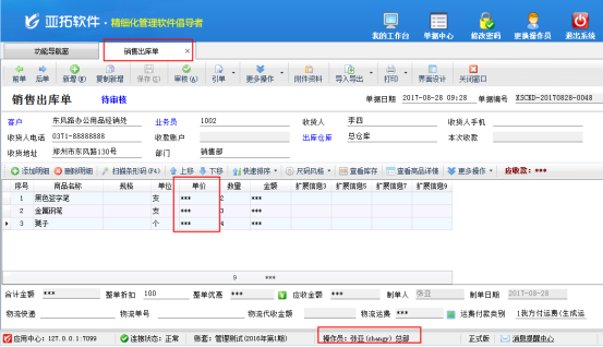 亞拓管理軟件支持設(shè)置不同的操作員進(jìn)行登錄軟件,有的客戶需要操作員開單不允許看到銷售價(jià)格,軟件支持在操作員權(quán)限及授權(quán)中設(shè)置操作員不能查看銷售價(jià)格。 演示視頻觀看鏈接:如何設(shè)置操作員不允許查看銷售價(jià)? 以亞拓管理軟件專業(yè)版本為例,首先打開系統(tǒng)管理—》操作員及