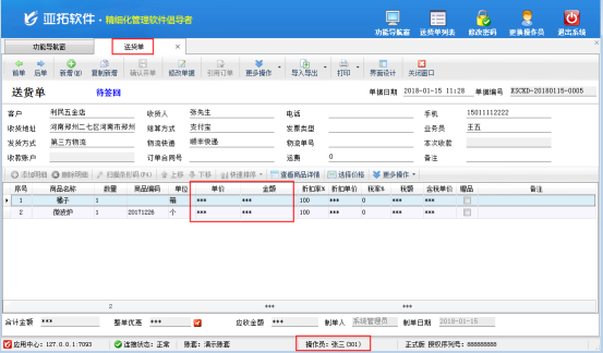 信管飛送貨單軟件(原“紅管家送貨單軟件”)支持多個(gè)操作員登錄使用軟件,可以對(duì)不同的操作員設(shè)置不同的權(quán)限。有些客戶不允許操作員查看商品銷售價(jià),軟件支持在“操作員管理及授權(quán)”中設(shè)置操作員不能查看銷售價(jià)格,下面我們?cè)敿?xì)介紹一下操作員不可查看商品銷售價(jià)的設(shè)置方法。 登錄信管飛送貨單軟件,在功能導(dǎo)航窗點(diǎn)擊“系統(tǒng)管理”—》“操作員及授權(quán)