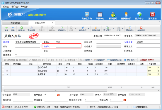 信管飛RMS軟件、信管飛倉庫管理軟件等默認開單的經手人或業務員不允許為空,如果您在開單時不需要錄入經手人或業務員,支持在軟件中進行設置。 以信管飛RMS軟件專業版為例,示范下如何設置開采購單經手人允許為空的方法。(銷售單的業務員允許為空操作步驟和此一致,不再贅述)