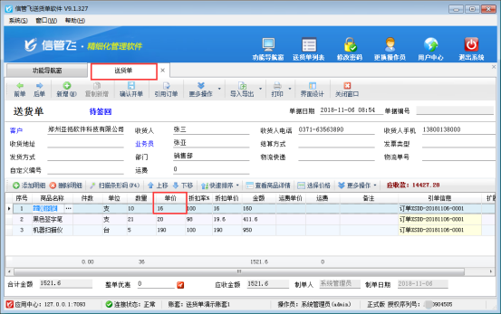 信管飛送貨單軟件、信管飛rms軟件、信管飛倉庫管理軟件等支持維護商品信息和商品價格信息,便于開單直接選擇商品時價格自動獲取。軟件默認開單時候價格信息允許修改,為了避免多操作員開單時出現(xiàn)價格修改錯誤情況,軟件支持設置參數(shù),不允許在明細中修改價格信息。 以“信管飛送貨單軟件”為例,示范如何設置開單時單價不