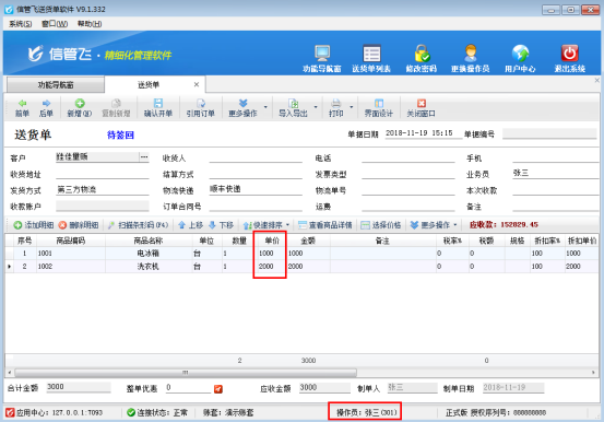 信管飛送貨單軟件、信管飛RMS、信管飛倉庫管理軟件等默認開單時金額信息允許修改,為了避免操作員開單時出現(xiàn)金額修改錯誤情況,軟件支持設置操作員不可修改銷售金額的權限。以“信管飛送貨單軟件”為例,講一下如何設置操作員不可修改銷售金額。 在功能導航窗選擇“系統(tǒng)管理”—》“操作員及授權”,進入操作員管理及授權界面,以操作員“張三”為