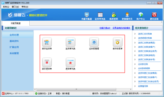信管飛送貨單軟件是集送貨單、退貨單、訂單、銷(xiāo)售收款等功能為一體的送貨管理及打印軟件。 軟件界面默認(rèn)顯示所有的功能模塊,主要包括新開(kāi)送貨單、送貨單列表、應(yīng)收款管理、新開(kāi)收款單、收款單列表、新開(kāi)退貨單、退貨單列表、新開(kāi)訂單、訂單列表。軟件支持隱藏不需要的功能模塊,下邊我們?cè)谛殴茱w送貨單軟件中示范如何隱藏不