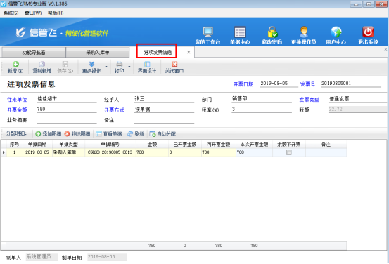 企業在開采購入庫單和銷售出庫單時都存在開發票的情況,信管飛RMS軟件發票管理功能可以讓企業高效快速地管理發票信息。發票管理功能支持對銷項發票的領購登記、使用(填開、作廢)等整個流程的管理,并能夠全面記錄銷項增值稅專用發票、銷項普通發票以及各種進項發票的開具信息。 發票管理為擴展模塊,只有信管飛RMS標準版和專業版支持附加使用