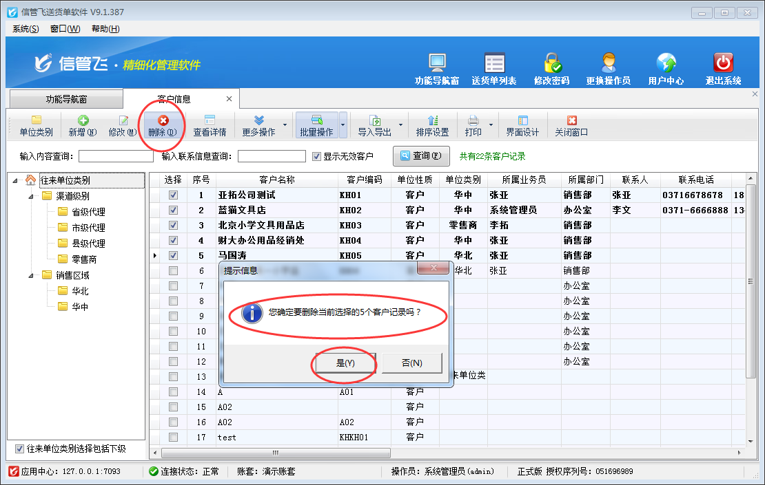 送貨單打印軟件支持維護客戶信息,出現客戶信息大范圍錄入錯誤時,軟件支持對錯誤客戶資料進行批量刪除操作,避免一個一個刪除的麻煩。以信管飛送貨單軟件為例示范下如何操作? 在功能導航窗選擇“基礎資料”—》“客戶信息”進入客戶信息管理界面,選擇工具欄的“批量操作”按鈕,進入批量操作模式,選擇需要刪除的客戶信息(批量操作支持全選、全不