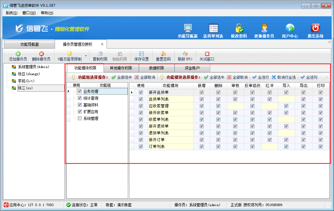 進銷存管理軟件、倉庫管理軟件、出納記賬軟件、送貨單軟件等都支持設置多個操作員登錄軟件,本文以送貨單軟件為例演示一下如何新增操作員賬號并設置操作員權限? 操作員及授權實現對操作員的管理和權限分配。權限分為功能模塊權限、其他操作權限、數據權限等。另外部分權限(如資金賬戶權限)需要在“系統參數配置”中啟用相應的參數,才可以使用。&