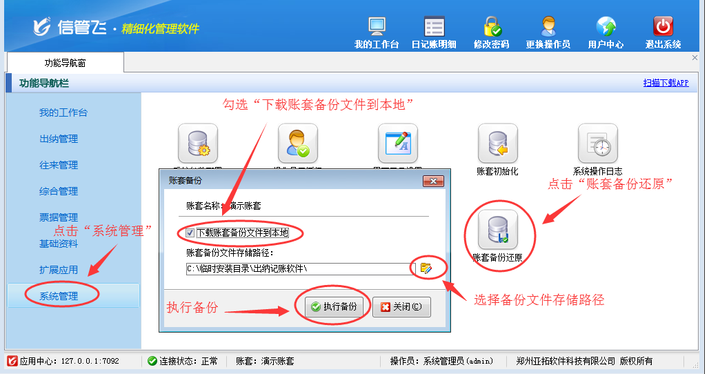 信管飛出納記賬軟件、信管飛送貨單軟件、信管飛RMS等軟件賬套數據默認存儲在軟件安裝目錄下,支持對賬套數據進行備份,如需要更換主機電腦,需要在原來的主機電腦上備份賬套數據,將生成的備份文件復制到新的主機電腦上,然后在新的主機電腦上安裝軟件,使用備份文件還原數據即可。    以信管飛出納記賬軟件為例,演示一下更換電腦時如何在原來的主機