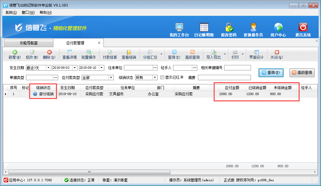 付款結算單用來登記付款信息(付款對象即供應商、付款賬戶、付款金額、經手人等),并結銷應付款記錄。正常情況下,應付金額為多少,即我們支付供應商多少貨款,但是部分情況下,我們給供應商支付貨款時可能因為各種原因只能給供應商支付其中一部分,然后過段時間在支付剩余貨款。本篇文章以出納記賬軟件為例演示一下部分付款的情況下如何開付款結算單。