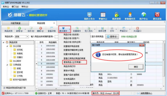 信管飛RMS軟件、信管飛倉庫管理軟件、信管飛送貨單軟件等支持設置多個操作員登錄軟件,對登錄的操作員軟件可控制操作員權限。開單過程中可能存在單據商品信息輸入錯誤現象,軟件可在基礎資料—》商品信息中對錯誤商品進行替換。為避免多個操作員重復替換出錯,可設置操作員不可批量替換商品(業務單據)的權限,可指定一個操作員允許操作。  &nbs
