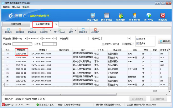 信管飛送貨單軟件支持開送貨單以及支持對已開單據明細匯總在送貨明細對賬單重,方便對賬。有時候需要把明細對賬單導出發給對應的客戶進行對賬。軟件送貨明細對賬單默認日期格式是顯示時間的,為了導出Excel文件更簡潔明了,軟件可設置送貨明細對賬單表的日期格式不顯示時間,只顯示出單據日期。 功能導航窗選擇“業務處