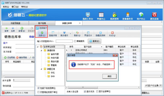 信管飛RMS軟件是集采購管理、銷售管理、庫存管理、往來賬管理等為一體的進銷存管理軟件。經常會有用戶問到刪除客戶資料時會彈出提示信息:“當前選擇的往來單位在單據中有使用,不能刪除”(如下圖一所示),刪除不了,為什么? 系統默認在單據中已使用過的往來單位信息是不能刪除的,因為如果刪除,則會影響之前已使用此往來單位信息