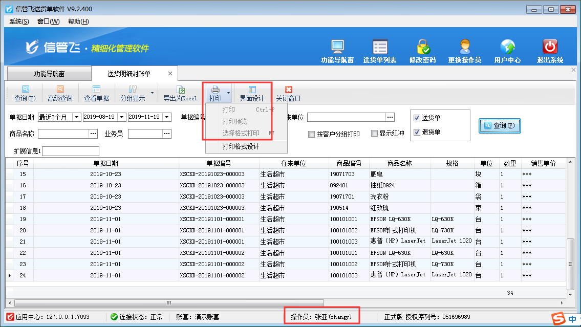 信管飛送貨單軟件為集訂單管理、送貨管理、收款結算等功能并支持送貨明細對賬及業務綜合對賬的送貨單打印軟件。軟件根據錄入的每張訂單及送貨單等數據,可以自動生成統計報表,完成企業銷售統計查詢和與客戶對賬的目的,如下圖所示。如果不希望員工賬號登錄后打印送貨明細對賬單,如何設置呢?本篇文章介紹一下具體操作步驟。    登錄軟件,在功能導航窗