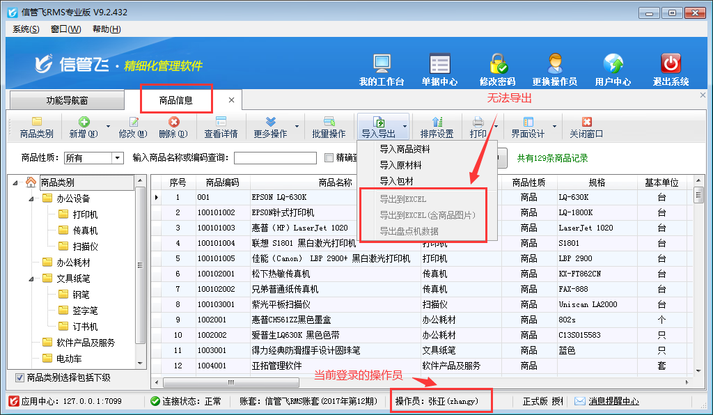 信管飛送貨單軟件、信管飛RMS、信管飛倉庫管理軟件等都支持管理基礎資料信息和允許設置多個操作員進行登錄軟件。軟件支持將基礎資料信息以EXCEL的形式導出放到自定義的文件夾內以便用戶備份或保存數據,如果需要設置操作員不允許導出商品信息,如何設置?本文以信管飛RMS專業版為例,示范下如何設置操作員不可導出商品信息。 在功能導航窗