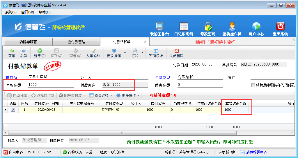 信管飛出納記賬軟件支持錄入供應商的期初應付款,期初應付款是指在使用軟件之前應付給供應商的金額,本文介紹一下軟件內錄入供應商期初應付款的操作方法。 在功能導航窗點擊“往來管理”—》“應付款管理”,即可打開應付款管理界面,在工具欄點擊“新增”按鈕,系統打開新增應付款窗口,如下圖所示,“應付類型”選擇為“期初應付款”,然后錄入應付