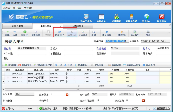 信管飛RMS(進銷存管理軟件)、信管飛倉庫管理軟件中業務單據已審核后默認是不允許刪除的,如下圖所示,刪除按鈕為灰色的,不可操作,那么如果單據審核后發現此單做錯了,需要刪除,如何操作呢?本篇文章詳細介紹一下倉庫管理軟件內如何刪除已審核的業務單據? 業務單據已審核后默認是不允許刪除的,如果需要刪除,需要先紅沖此單據,然后再刪除,