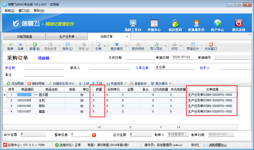 生產任務單,即生產過程中的任務加工單,用于執行生產計劃,進入實際生產階段。生產任務單分為生產明細和用料明細兩部分,生產明細中添加需要生產的產成品,然后根據選擇的生產模板可自動顯示生產產成品所需要的用料明細信息,如下圖所示。 另外軟件也支持配置根據原材料用料數量及原材料當前庫存數量自動計算出原材料需采購的數量,進而生成采購訂單