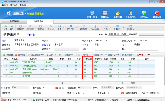 信管飛送貨單軟件、信管飛倉庫管理軟件、信管飛RMS(進銷存軟件)開單時,當商品存在打折情況時,支持錄入商品的折扣率。當商品明細的內容比較多時,為了快速開單,提高效率,可以批量更新單據明細中的折扣率。下面我們以信管飛RMS專業版為例詳細介紹下如何批量修改商品折扣率。    登錄軟件,在功能導航窗點“銷售管理”—》“銷售出庫單”,進入