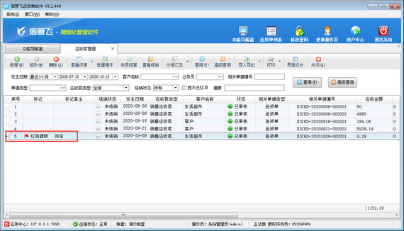 信管飛送貨單軟件支持管理客戶的應收款信息,可對應收款信息標記備注內容,本文演示一下具體操作步驟。    軟件登錄后,點擊“業務處理”—》“應收款管理”可以打開應收款管理界面,如下圖所示,應收款管理界面可以查看客戶的應收款信息及詳細結銷情況,應收款記錄一般由送貨單自動生成,其類型為“銷售應收款”,或者由退貨單自動生成,其類型為“銷售