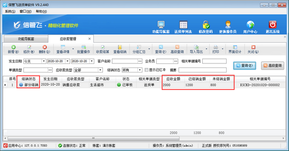 收款結算單用來登記收款信息(收款對象即客戶、收款賬戶、收款金額、經手人等),并結銷應收款記錄。正常情況下,應收金額為多少,客戶需支付我們多少貨款,但是部分情況下,客戶支付給我們貨款時可能因為各種原因只能給我們支付其中一部分,然后過段時間在支付剩余貨款。本篇文章以送貨單打印軟件為例演示一下部分收款的情況下如何開收款結算單。    如