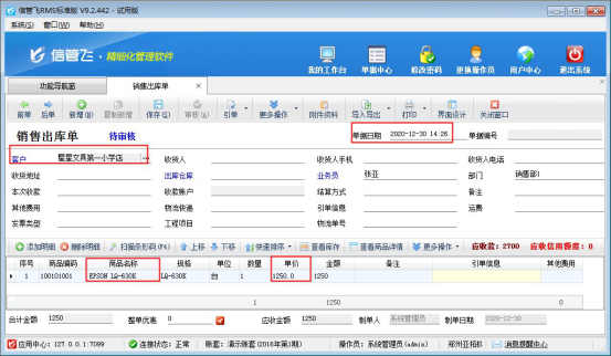 信管飛送貨單軟件、信管飛RMS軟件等都支持打印單據,軟件內置了十幾種打印模板以供使用。默認打印模板的金額是按財務樣式進行顯示的,默認金額格式是按7位顯示,只顯示到萬,如果出現金額超過萬位會顯示不出來(如下圖所示),本文以“信管飛送貨單軟件”為例,示范下如何修改金額樣式的顯示數字個數。     打開送貨單開單界