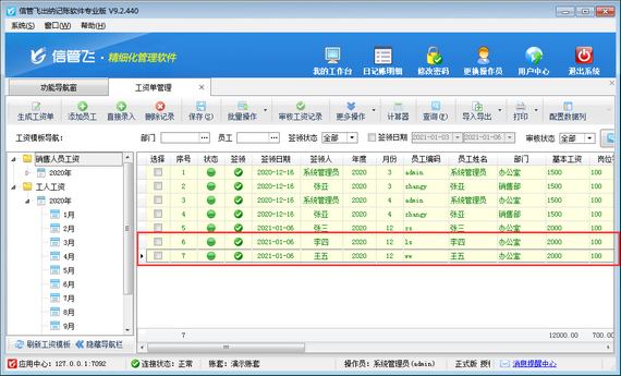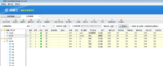 信管飛出納記賬軟件專業版包括工資管理功能,支持自定義工資模板,可根據設置的工資模板快速生成工資單,支持從上月工資單復制工資項目數據,工資項目數據錄入完成核對無誤后審核生效,審核后不再支持直接修改。如果工資記錄較多,逐條審核工資記錄會比較耗時,軟件支持批量審核工資記錄,可節省時間提高工作效率。本篇文章介紹一下出納記賬軟件中如何批量審核工資記錄? &nb