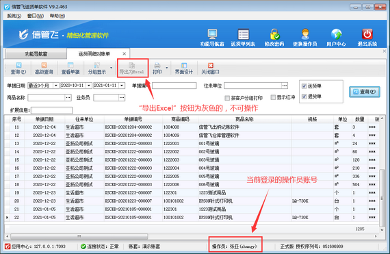 信管飛送貨單軟件為集訂單管理、送貨管理、收款結算等功能并支持送貨明細對賬及業務綜合對賬的送貨單打印軟件。軟件根據錄入的每張訂單及送貨單等數據,可以自動生成統計報表,完成企業銷售統計查詢和與客戶送貨明細對賬的目的,如下圖所示。如果不希望操作員賬號登錄后導出送貨明細對賬單,如何設置呢?本篇文章介紹一下具體操作步驟。    演示視頻觀看