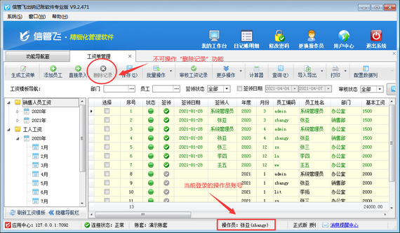 信管飛出納記賬軟件專業版包括工資管理功能,支持自定義工資模板管理員工工資單,可根據設置的工資模板快速生成工資單,支持從上月工資單復制工資項目數據。為了避免操作員刪除工資單,軟件中可以設置操作員不可刪除工資記錄權限。下邊我們在軟件中示范下設置操作員不可刪除工資記錄權限的操作步驟。    登錄軟件,在功能導航窗點擊“系統管理”—》“操