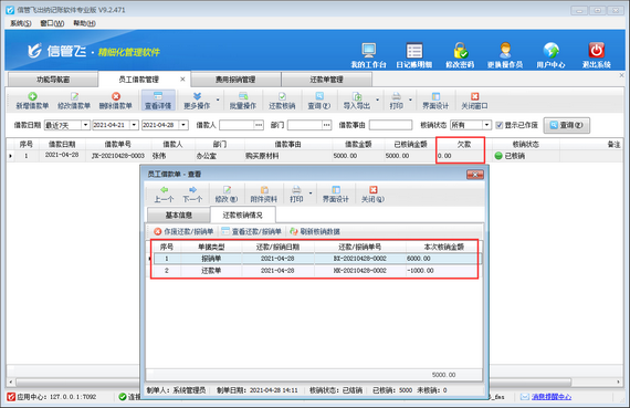 出納記賬軟件專業版的員工借款管理及還款管理功能可以對企業員工借款、還款進行流程化登記管理,提高 了企業管理效率。本篇文章介紹一下出納記賬軟件報銷金額大于借款金額,需要給員工退款的情況下,軟件內如何處理? 如下圖所示,員工“張偉”借款金額為5000元,費用報銷了6000元,報銷金額大于借款金額,導致欠款-1000元