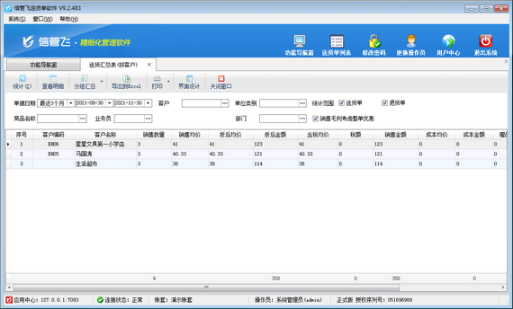 信管飛送貨單軟件為集訂單管理、送貨管理、收款結算等功能并支持送貨明細對賬及業務綜合對賬的送貨單打印軟件。軟件根據錄入的每張訂單及送貨單等數據,可以自動生成統計報表,完成企業銷售統計查詢和與客戶送貨明細對賬的目的,如下圖所示。    其中,送貨匯總表(按客戶)可根據單據日期、客戶名稱、商品名稱等查詢條件,統計銷售給每個客戶的商品匯總